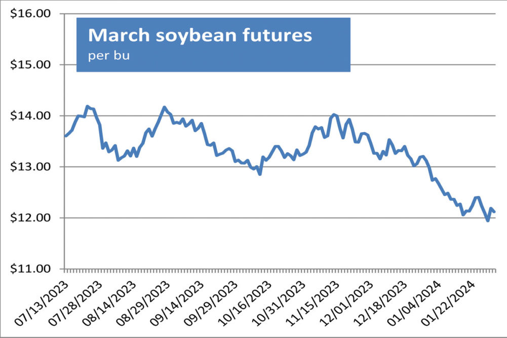 - Bargain buying off multi-year lows sent corn and soybean futures higher Tuesday despite the absence of supportive supply-demand news. Corn futures were down 5% for the month while soybean futures were down 6% in the same period, a reflection of ample US supplies after 2023’s bumper crops and rising confidence in South American crops. Wheat complex futures followed the firm trend, bouncing off one-week lows. The March corn future added 7½¢ to close at $4.47¾ per bu. Chicago March wheat advanced 12¢, closing at $6.05½ per bu. Kansas City March wheat jumped 12½¢ to close at $6.30¾ per bu. Minneapolis March wheat climbed 6½¢ to close at $6.99¾ per bu. March soybeans soared 24½¢ to close at $12.18¾ per bu. March soybean meal added $8.70 to close at $363 per ton. March soybean oil added 0.45¢ to close at 46¢ a lb.