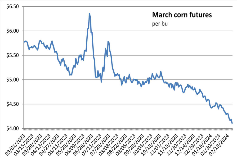 - Corn futures dropped to three-year lows Wednesday on plentiful domestic supply and signals South American export competitors will harvest strong crops this year. Wheat complex futures pulled lower under pressure from ample global supplies and strong export competition, except for the nearby Chicago future, which pulled higher as shippers looked to backfill sales to China. The soy complex futures followed corn’s lower trend. The March corn future shed 7¾¢ to close at $4.11 per bu. Chicago March wheat edged up ½¢ to settle at $5.83¼ per bu, though all forward contracts declined. Kansas City March wheat fell 8½¢ to close at $5.77¼ per bu. Minneapolis March wheat declined 6¼¢ to close at $6.59¼ per bu. March soybeans dropped 18¼¢ to close a $11.60¾ per bu. March soybean meal pulled back $5.60 to close at $342 per ton. March soybean oil lost 0.58¢ to close at 44.83¢ a lb.